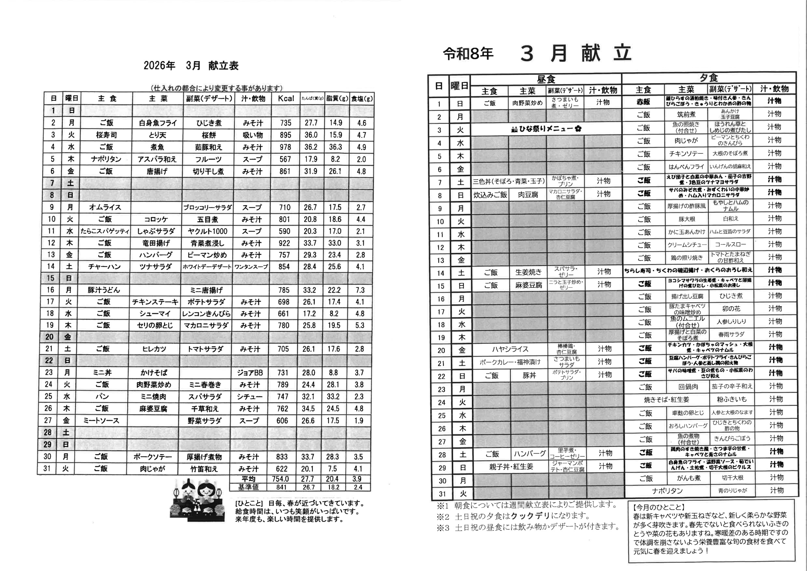 令和8年3月の献立